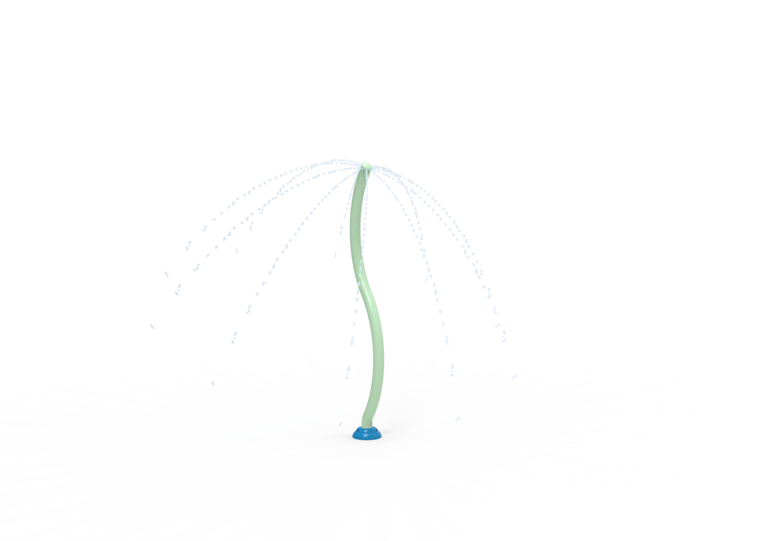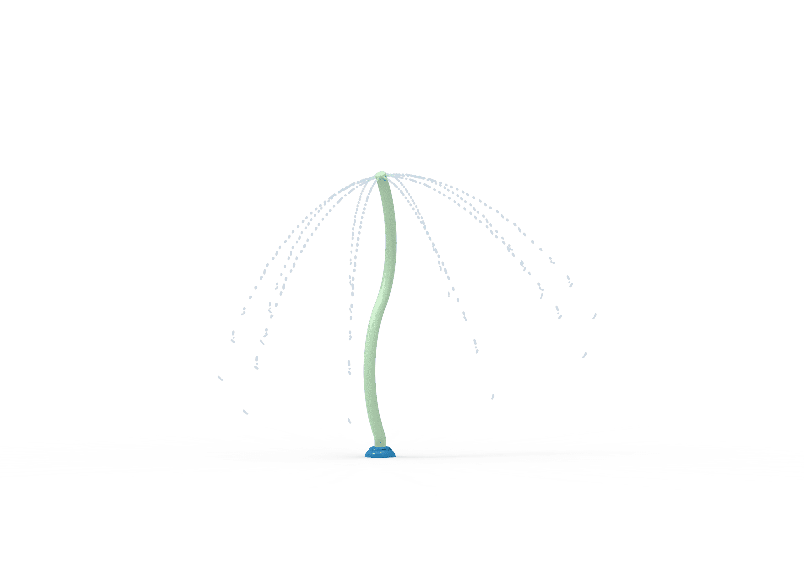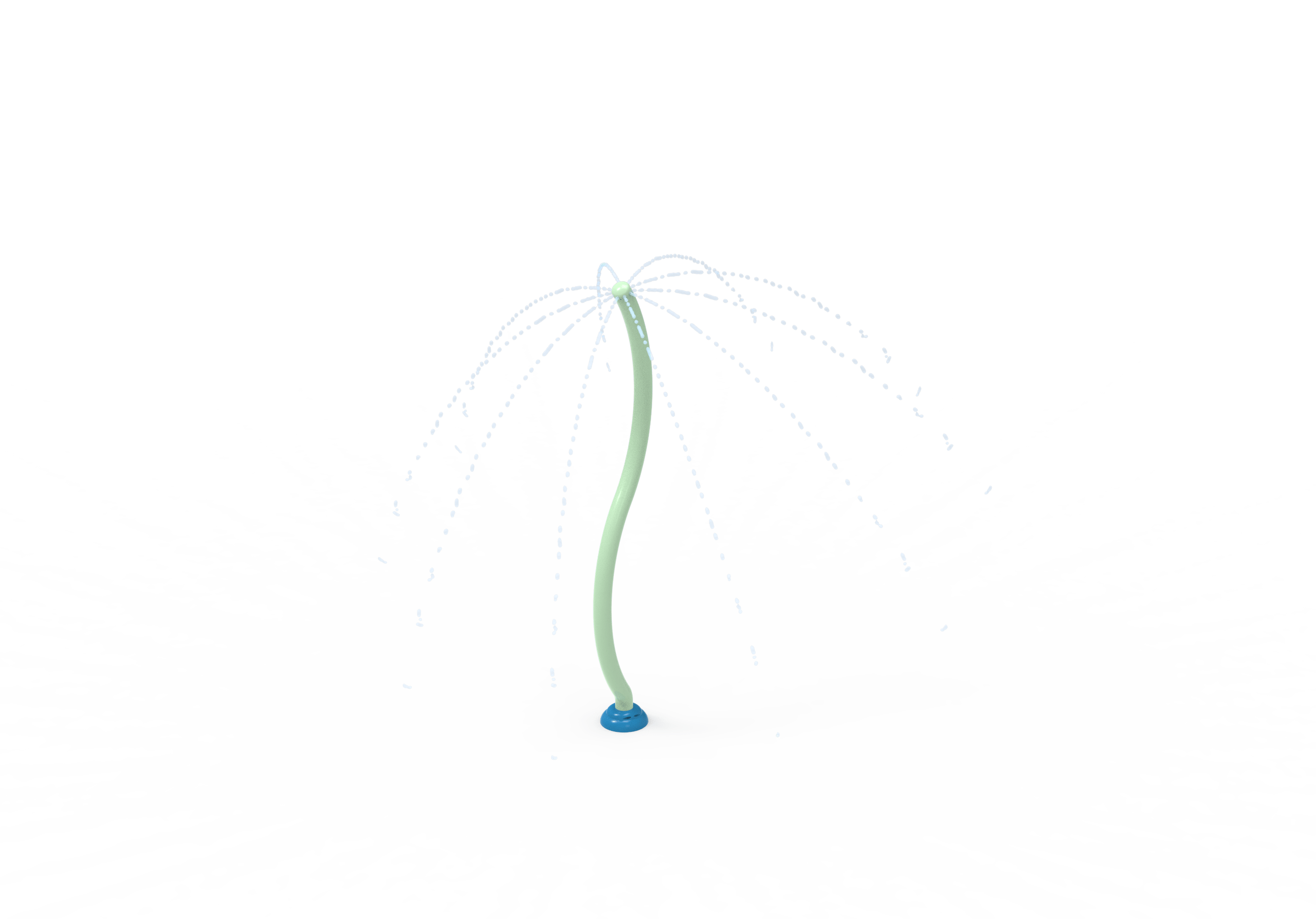 El Alga es un juego acuático diseñado para aportar movimiento, frescura y un toque natural a cualquier splash park. Su estructura curva simula la silueta de un alga marina, proyectando chorros de agua desde la parte superior que caen en forma de arco, creando un efecto visual envolvente que invita a los niños a correr, saltar y jugar bajo la lluvia refrescante.